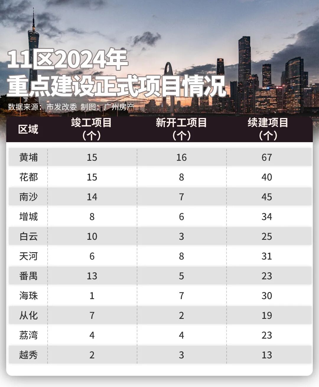 2024年,广州安排市重点项目844个,年度计划投资3805亿元。在这份重点项目清单中,花都区以72个项目数量位居全市第二,其中,正式项目63个,包含15个竣工项目,8个新开工项目、40个续建项目、预备项目9个。