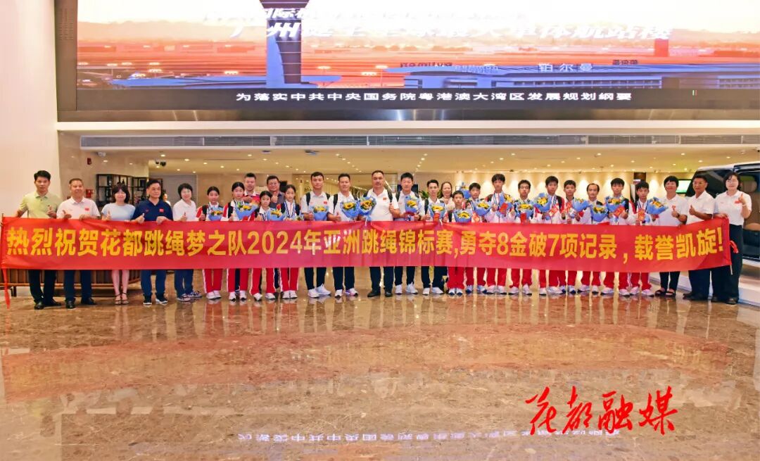 7月31日凌晨,在2024年亚洲跳绳锦标赛上摘金夺银的13名中国跳绳队花都健儿载誉凯旋,在白云国际机场受到热烈欢迎。