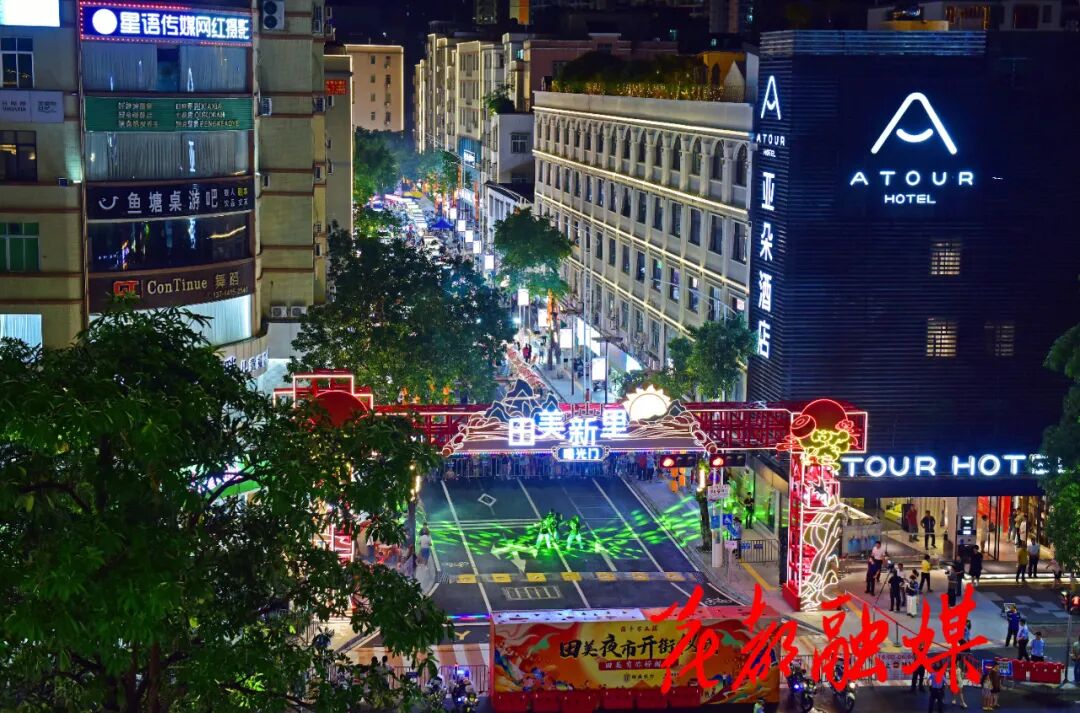 9月15日晚上,花都区新华街碧秀路“田美新里”特色商业街,在激昂的鼓声中,奏响开街之声,伴随冷烟花的绽放和荧光舞狮的欢乐演出,田美夜市盛大启市。