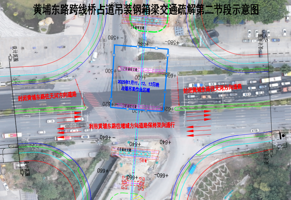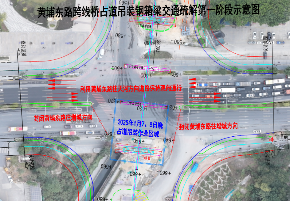 根据施工计划,第一阶段交通疏解将于2025年1月7、8日进行,封闭黄埔东路往增城方向车道,利用黄埔东路往天河方向车道保持双向通行;第二阶段交通疏解将于2025年1月11、12、13日进行,封闭黄埔东路往天河方向车道,利用黄埔东路往增城方向车道保持双向通行。