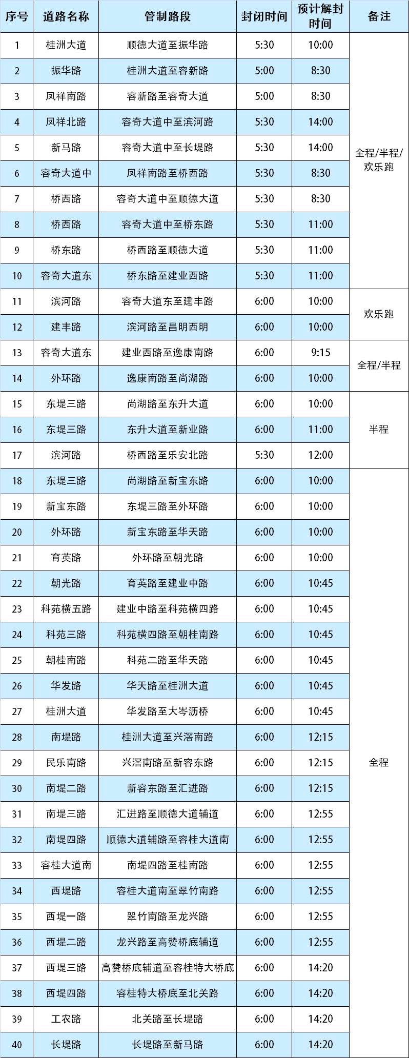 ①1月4日12时起,封闭桂洲大道中(振华路至顺德大道)西往东车道,进行起点拱门搭建、LED屏、舞台等赛前设施施工,期间禁止车辆通行及停放。1月5日赛事起跑结束及拆除相关设施后,预计10时解封;