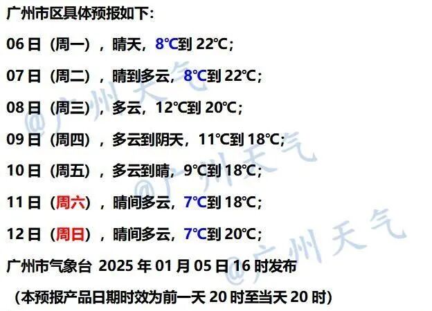 最低气温:粤北和珠三角北部市县介于3~6℃,南部沿海市县10~12℃,其余市县7~10℃。