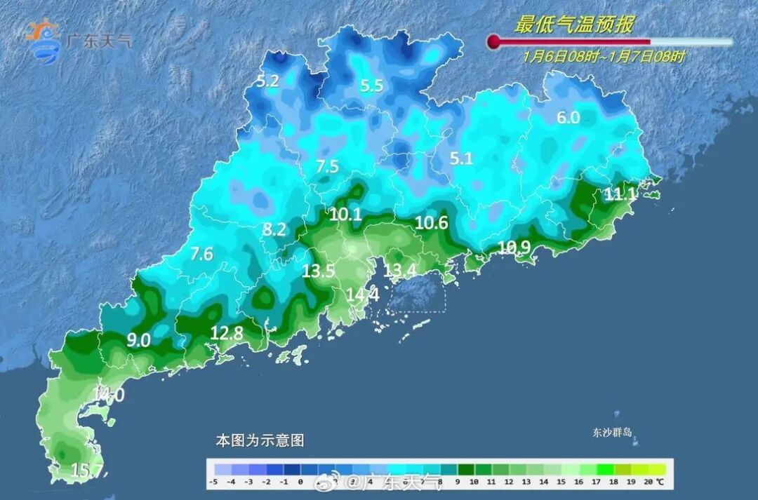 最低气温:粤北大部分市县介于5~9℃,粤西、珠三角中南部、粤东市县11~14℃,其余市县9~11℃。