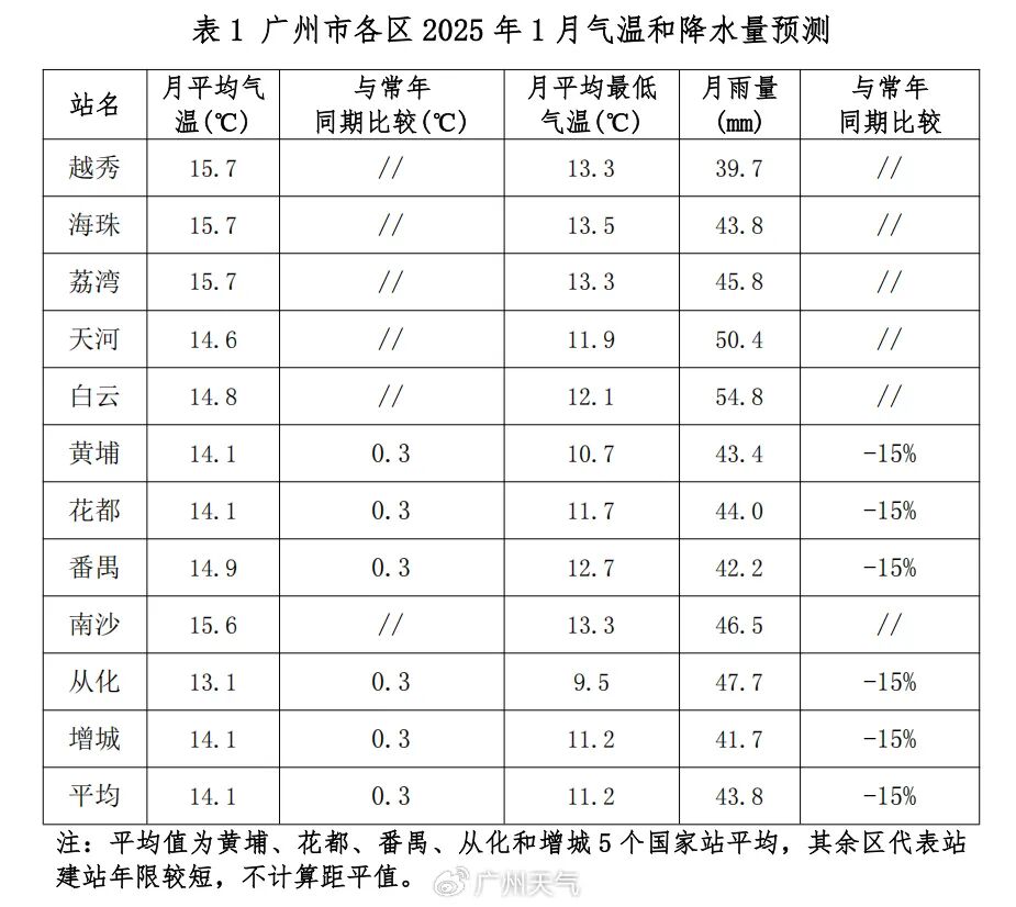 此前,广东省2025年1月气候趋势预测,1月内主要有4次冷空气过程:大致出现在——1月3-6日(弱)、1月8-10日(弱)、1月14-16日(中等)、1月24-27日(中等偏强)。月内主要有3次降水过程:大致出现在——9-10日(小雨)、15-17日(小雨)、24-27日(小雨)。