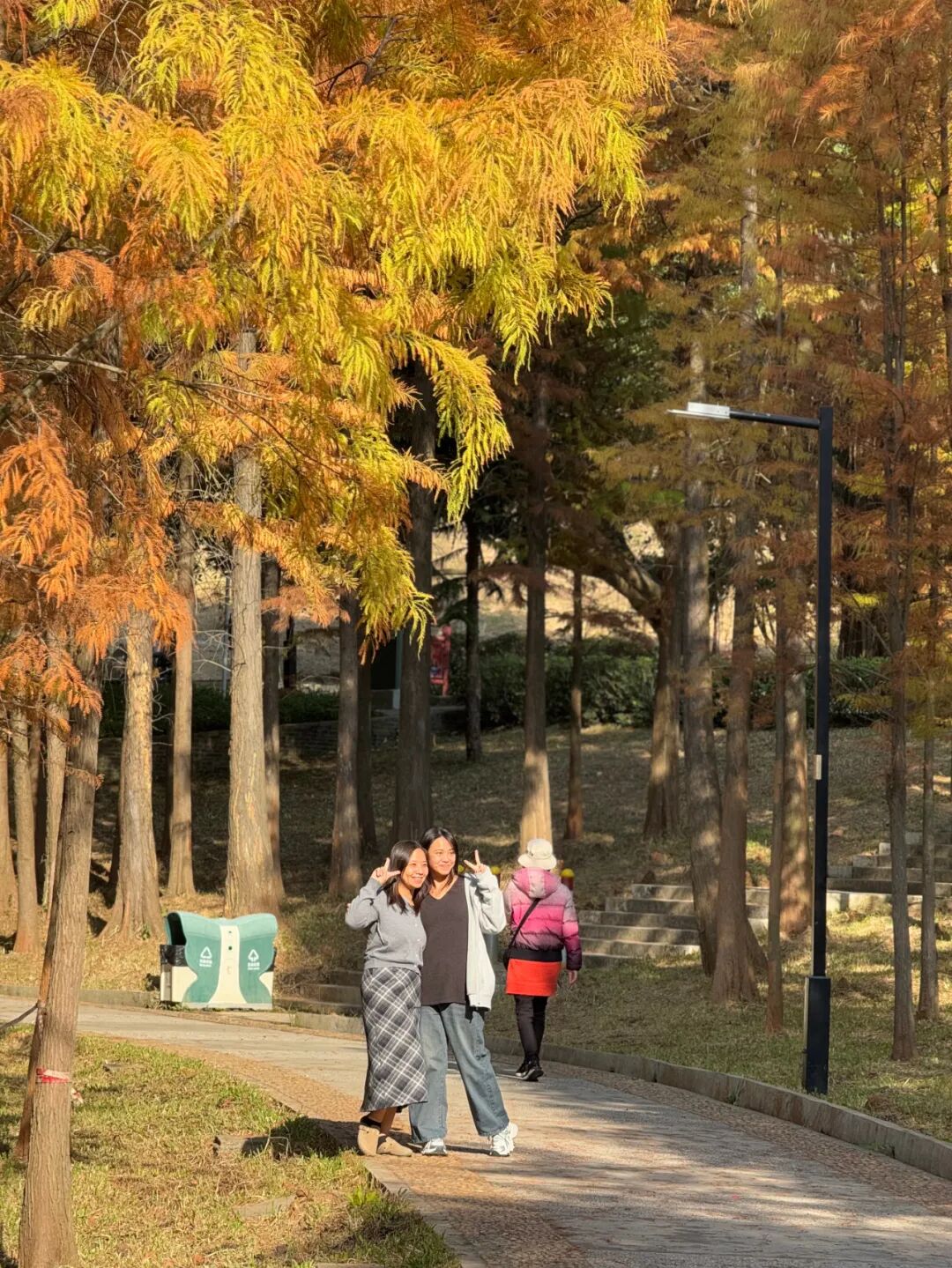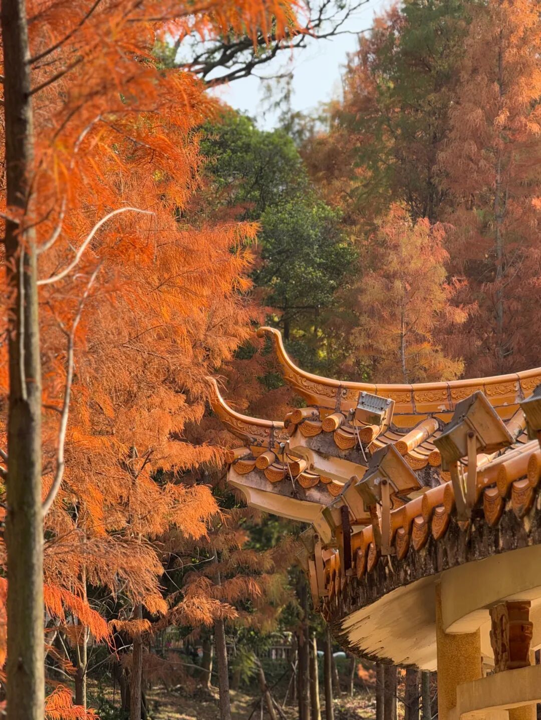 走进落羽杉林,只见一棵棵高大的落羽杉挺拔而立,枝叶繁茂,色彩浓烈。在冬日暖阳的照耀下,落羽杉林仿佛自带滤镜,随手一拍就是高清壁纸。