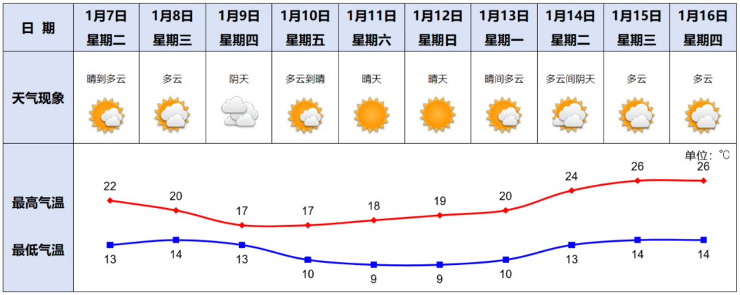 1月7日晴到多云,13~22℃,相对湿度35%~60%;8日多云,14~20℃;9日阴天,13~17℃。(荔湾区气象台1月6日17时发布)