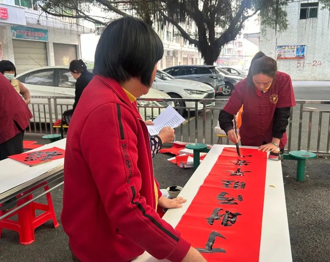 活动现场,来自云安区书法家协会的书法家为军人家属义写春联,工作人员协助并介绍春联的文化内涵和书写技巧,送上新春祝福。“发扬革命传统,争取更大光荣。”“迎春迎喜迎富贵,接福接财接平安。”不一会儿,广场上摆满了春联,现场充满喜庆祥和的气氛。