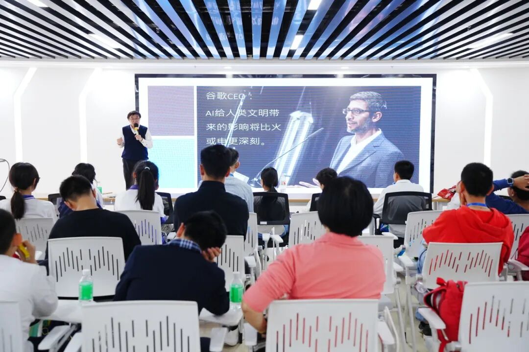 广州软件院人工智能实验室主任陈振冲从“大模型”这一概念出发,结合生动的例子和前沿的技术展示,向在场的学生们介绍了人工智能领域内的最新发展情况,特别是关于ChatGPT这类大型语言模型的相关知识。他解释了这些模型是如何通过大量的数据训练,从而具备了与人类交流的能力,并展示了它们在日常生活中的各种应用场景。