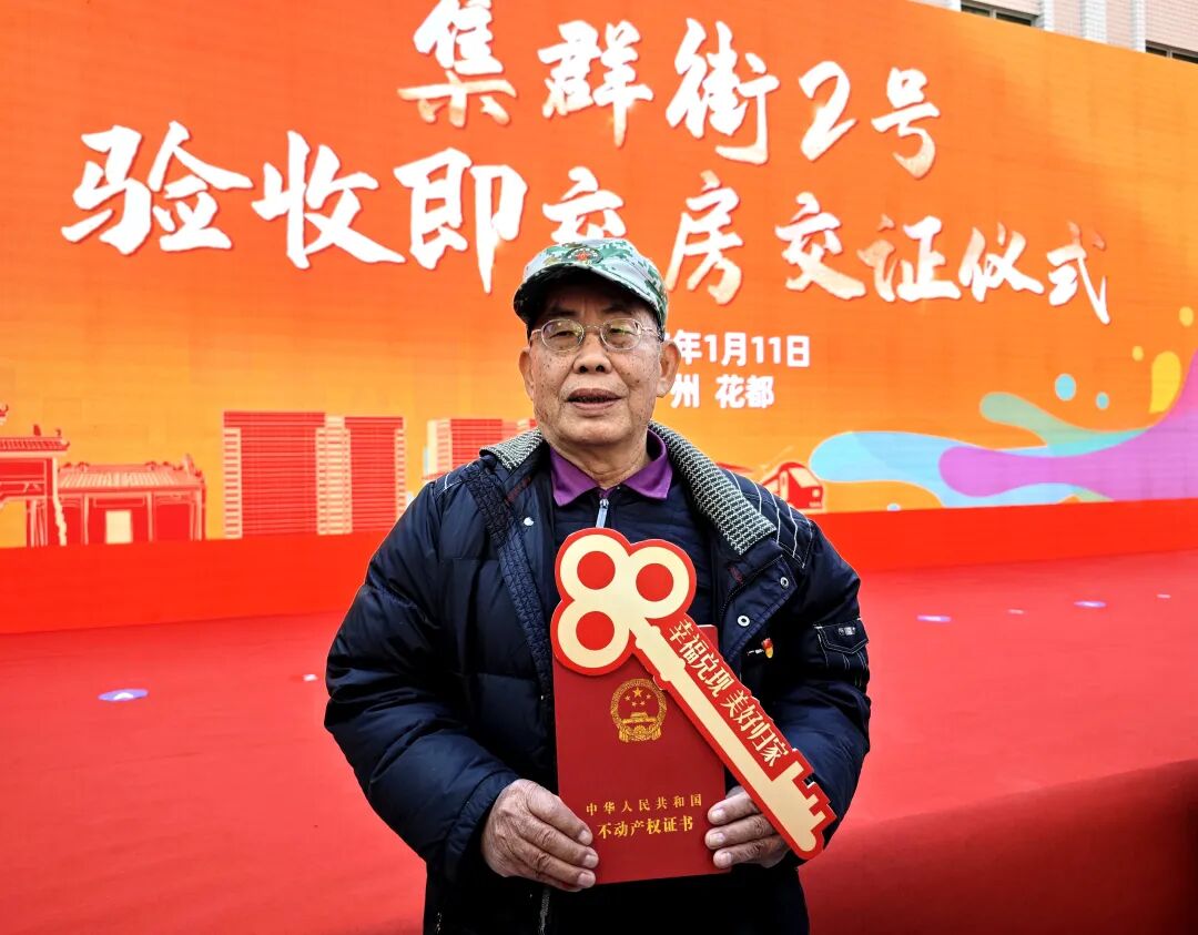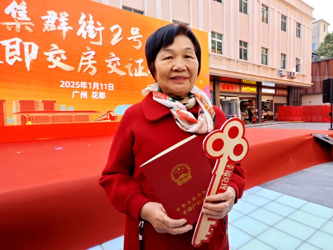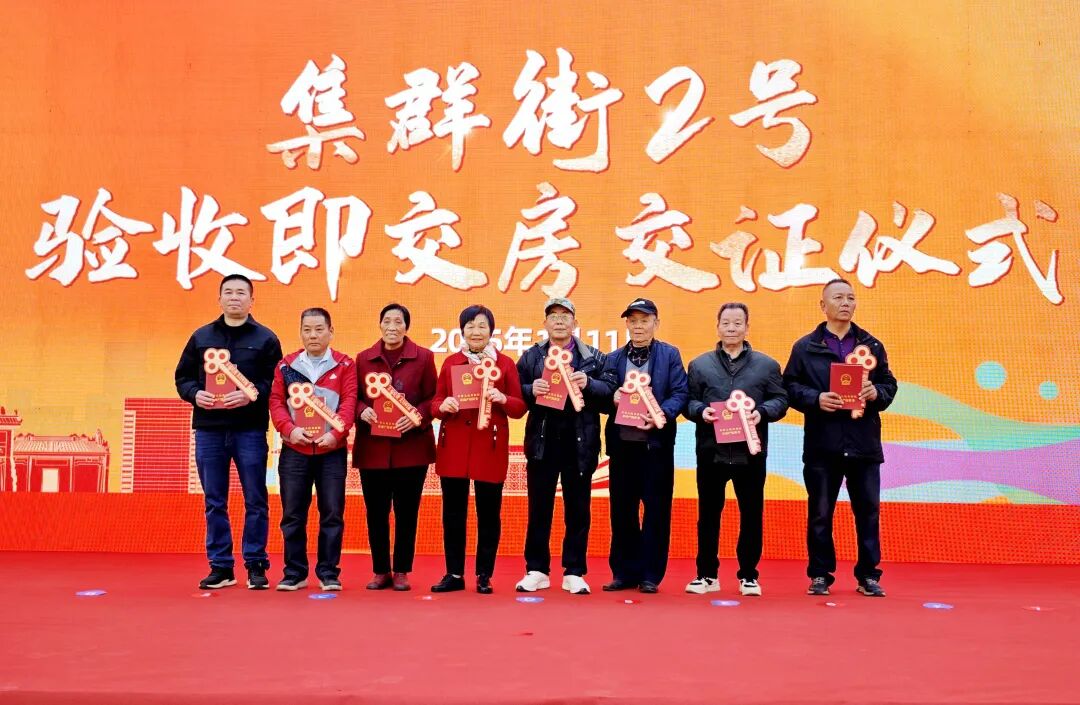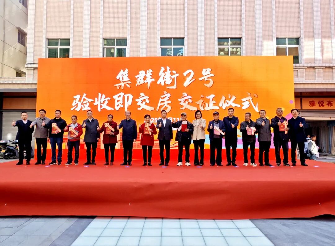 广东省住房和城乡建设厅、广州市住房和城乡建设局、广州市“百千万工程”指挥部办公室、花都区领导,企业代表、居民代表汇聚一堂,共同见证集群街2号交房、交证。