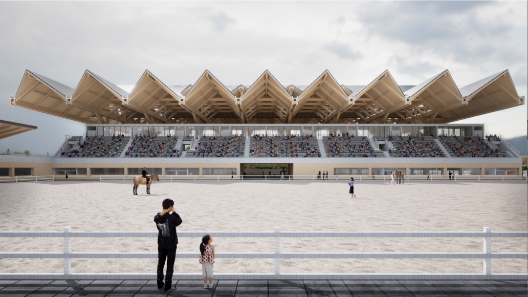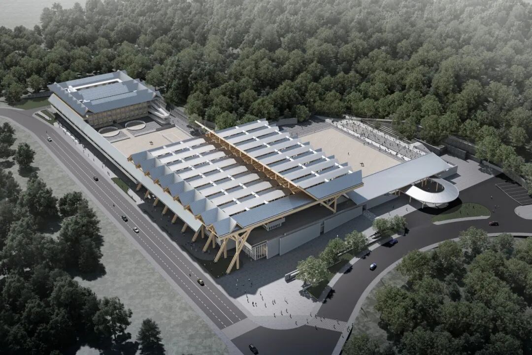 主场馆设计以“木构新境、众檐共景”为设计概念,建筑屋面整体采用胶合木结构,形态塑造源于中国传统建筑坡屋顶形式,既保留了原型屋架的特征,又以非常规的体量凌空而出,形成蕴含结构逻辑的发散式密“檩”, 得以与现代语境融通,展现出木构建筑纯粹的结构美学与文化意味。