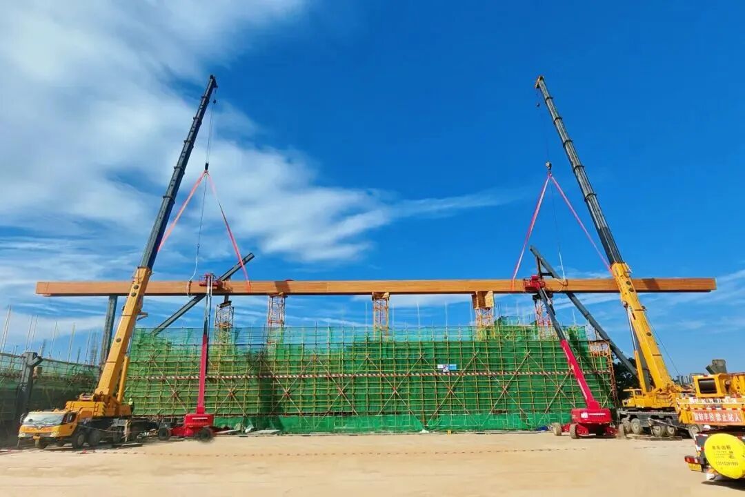 2024年10月3日,随着首榀木梁平稳准确就位,建设单位顺利完成96米长木梁吊装,标志着项目建设进入木结构施工阶段。