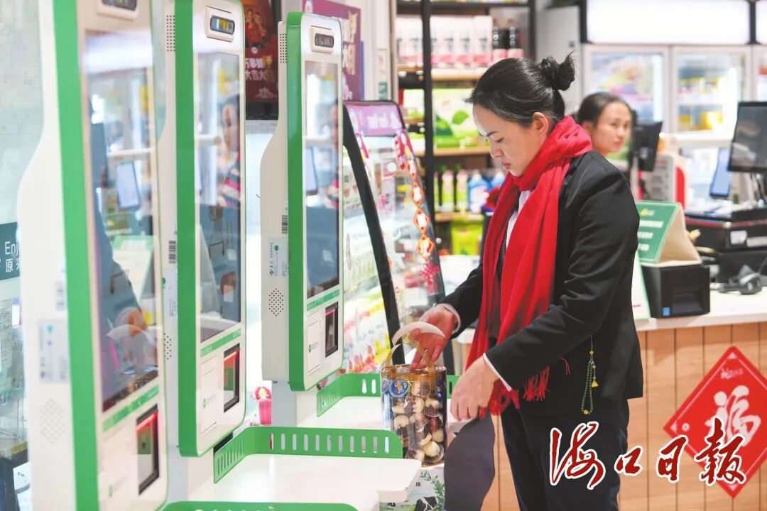 1月12日,在旺佳旺超市金牛店,市民正在使用自助结账系统便捷购物。海口市融媒体中心记者 杨鹤 摄