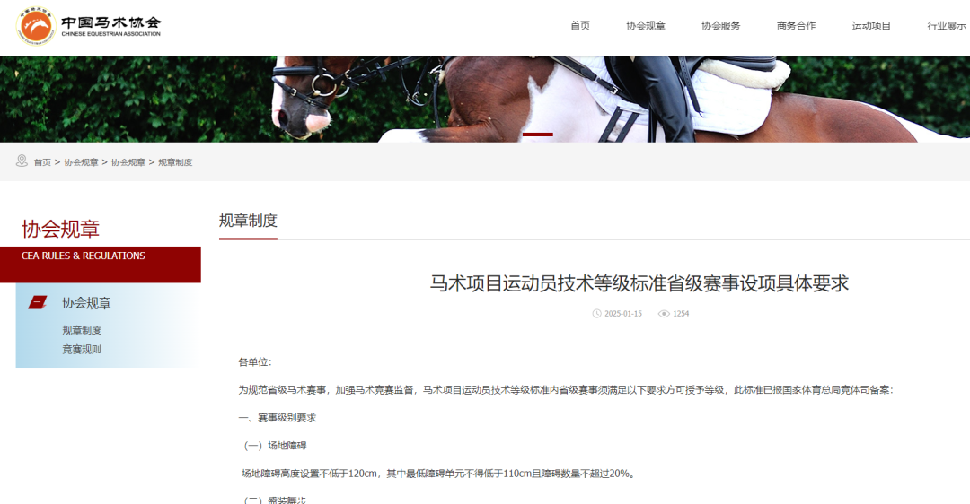 近日中国马术协会官网发布了《马术项目运动员技术等级标准省级赛事设项具体要求》,要求所示为规范省级马术赛事,加强马术竞赛监督,马术项目运动员技术等级标准内省级赛事须满足以下要求方可授予等级。