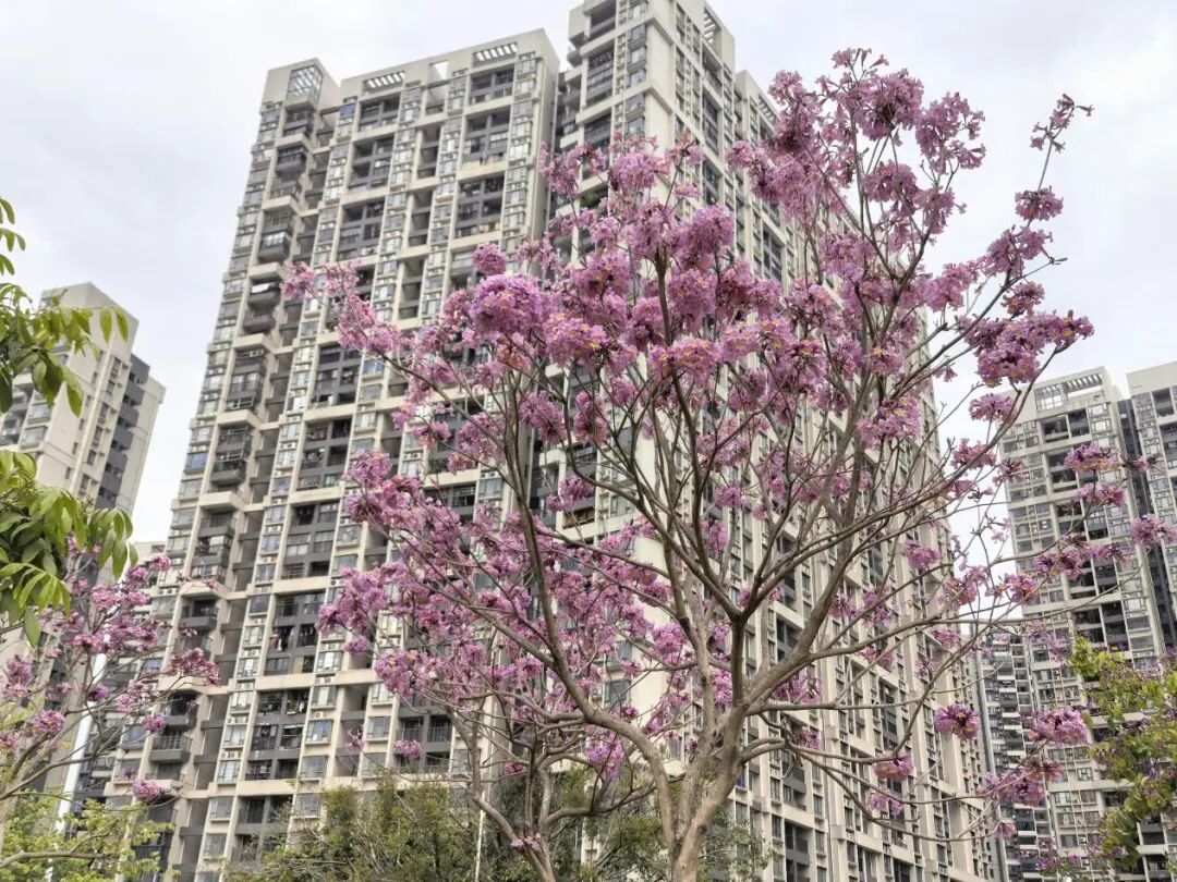 近期,位于西湾路口袋公园的紫花风铃木开花了,盛开的花朵呈粉紫色,像极了一个个风铃,挂在树上随风摇曳,美丽灵动。微风吹过,落英缤纷,仿佛下了一场粉紫色的雪,唯美浪漫。路过的行人纷纷停步拍照,口袋公园成了西村地区的新晋网红打卡点。