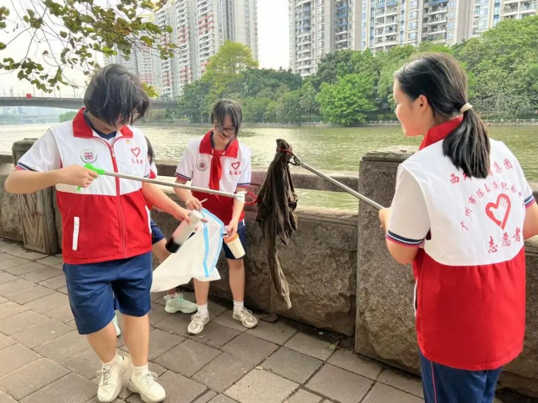 西村街道与辖内13所中小学幼儿园共建,聘请“小河长”“小林长”153名,同时将西村街道河长基地、增埗河绿道、增埗公园、和苑社区和心绿洲等点位串联起来,形成一条独具特色的生态文明实践路线。让中小学生走出教室,与社区党员、群众、志愿者一同,组成巡河、护林志愿者队伍,定期开展绿植补种、垃圾清理、巡河护河等工作,对增埗河和王圣堂涌1.9公里河岸线及周边社区进行绿化美化,近两年来累计清理河岸垃圾约0.3吨、新种绿植330余株。