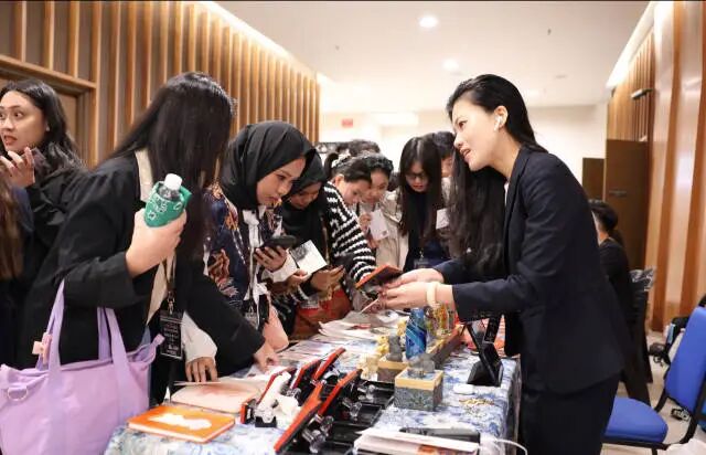 在亚洲文化遗产保护利用大赛马来西亚古晋决赛现场,陈苗向外国友人展示产品。