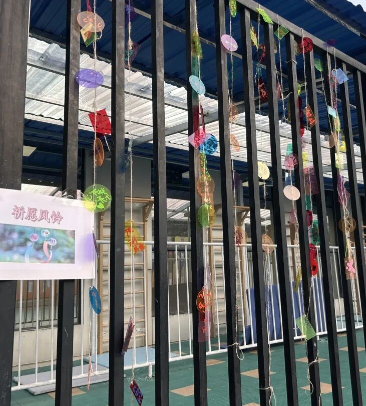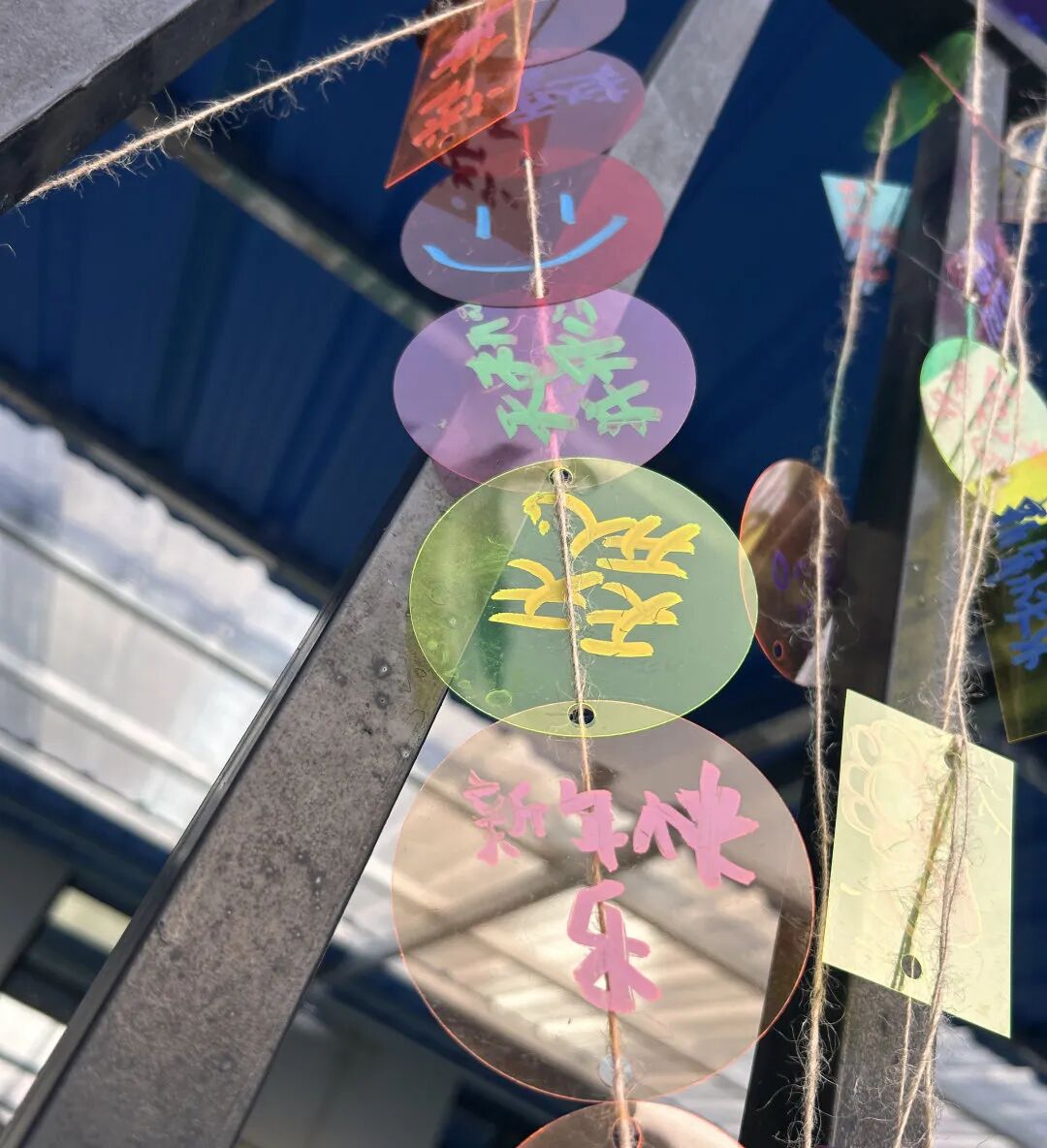 每位学生领取一片彩色玻璃纸,并在上面绘画喜欢的图案或写上自己的新年愿望,由志愿者帮助悬挂在栏杆上,大家的作品汇集在一起就像是一串串的彩色风铃,随着微风摇摆。