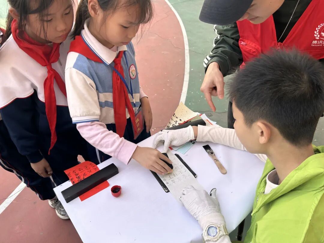 在活字印刷体验摊位中,学生们在志愿者的指导下,在活字板上刷上墨水并用宣纸进行印刷,体验活字印刷的奇妙。
