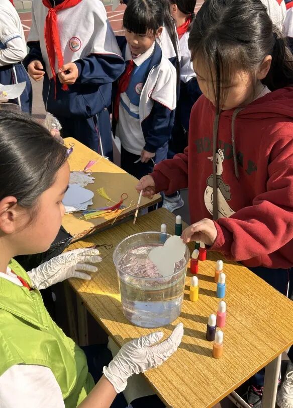 学生们在水里滴入喜欢的漆料,将书签缓缓放入水中,染出各种色彩纹路的书签,看着自己制作的作品大家都感到很有成就感。