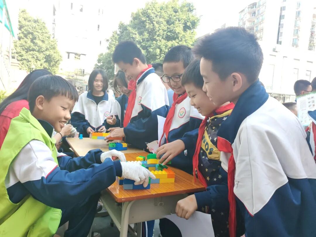 学生们发挥想象力,用各种形状的乐高七巧板填满正方形框架,摊位内欢声笑语此起彼伏。