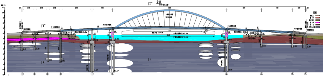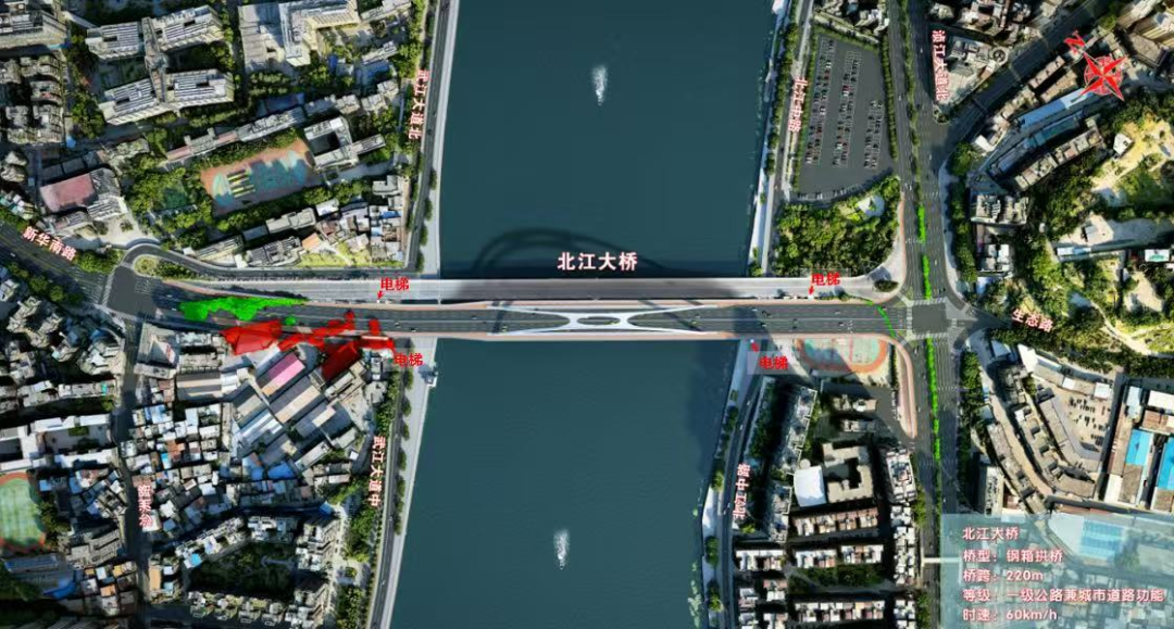 新建北江大桥位于北江旧桥下游约30m,新桥施工期间,旧桥可保持通行。北江大桥按照一级公路兼顾城市道路功能、双向六车道、设计时速60km/h的标准建设,路线长度0.874km,最大纵坡约4%。桥梁全长510.4m,主桥采用220m下承式系杆钢箱拱桥,主桥宽度41.1m,引桥采用钢箱梁与预制小箱梁。桥头端部设置电梯,方便自行车过桥。