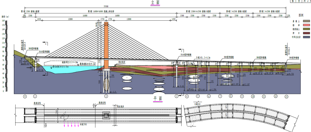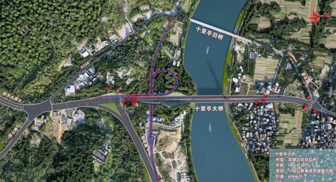 新建十里亭大桥位于十里亭旧桥下游约330m,新桥施工期间,旧桥可保持通行。十里亭大桥按一级公路兼顾城市道路功能、双向四车道、设计时速60km/h的标准建设,路线长度1.311km,最大纵坡约2.5%。桥梁全长597.2m,主桥采用2×160m混凝土斜拉桥,桥梁宽度33.6m,引桥采用预制小箱梁。