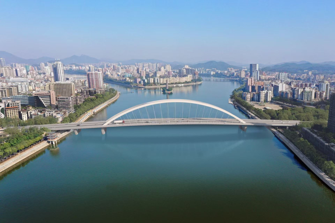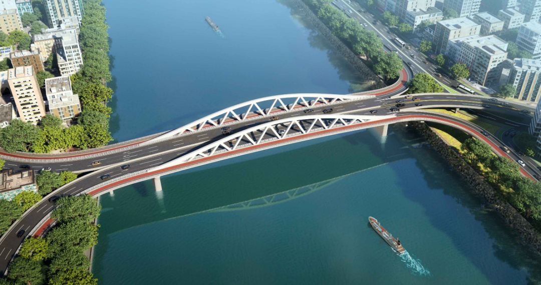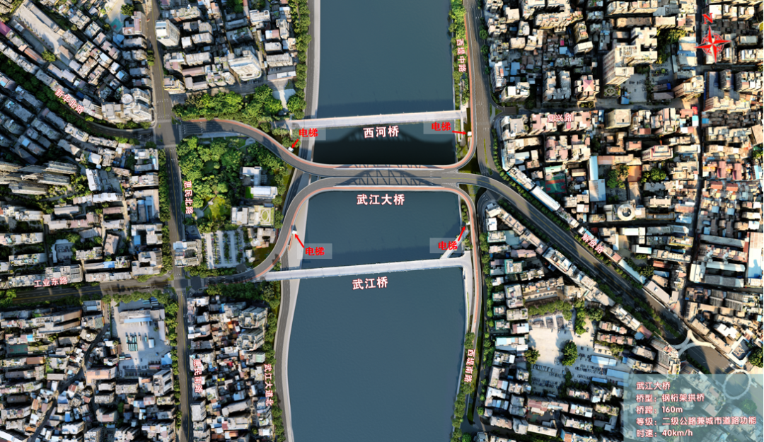 新建武江大桥位于西河大桥旧桥下游约85m处,新桥施工期间,旧桥可保持通行。武江大桥按二级公路兼顾城市道路功能、双向六车道、设计时速40km/h的标准建设,路线长度0.8km,最大纵坡约4%。主桥采用160m钢桁架梁桥,桥梁宽度39.2m,引桥及匝道采用预制小箱梁与钢箱梁。两岸设置电梯,方便自行车过桥。