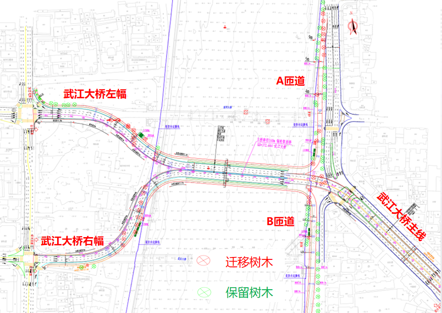 图3.1-1武江大桥推荐方案及树木迁移示意图