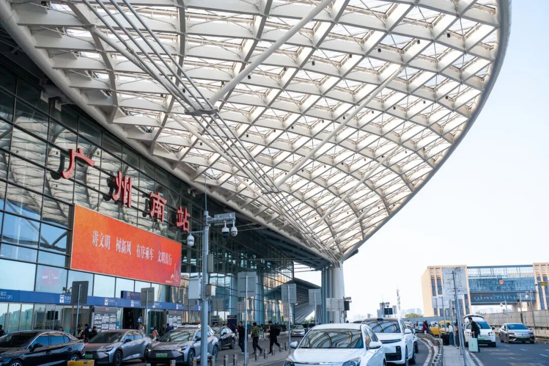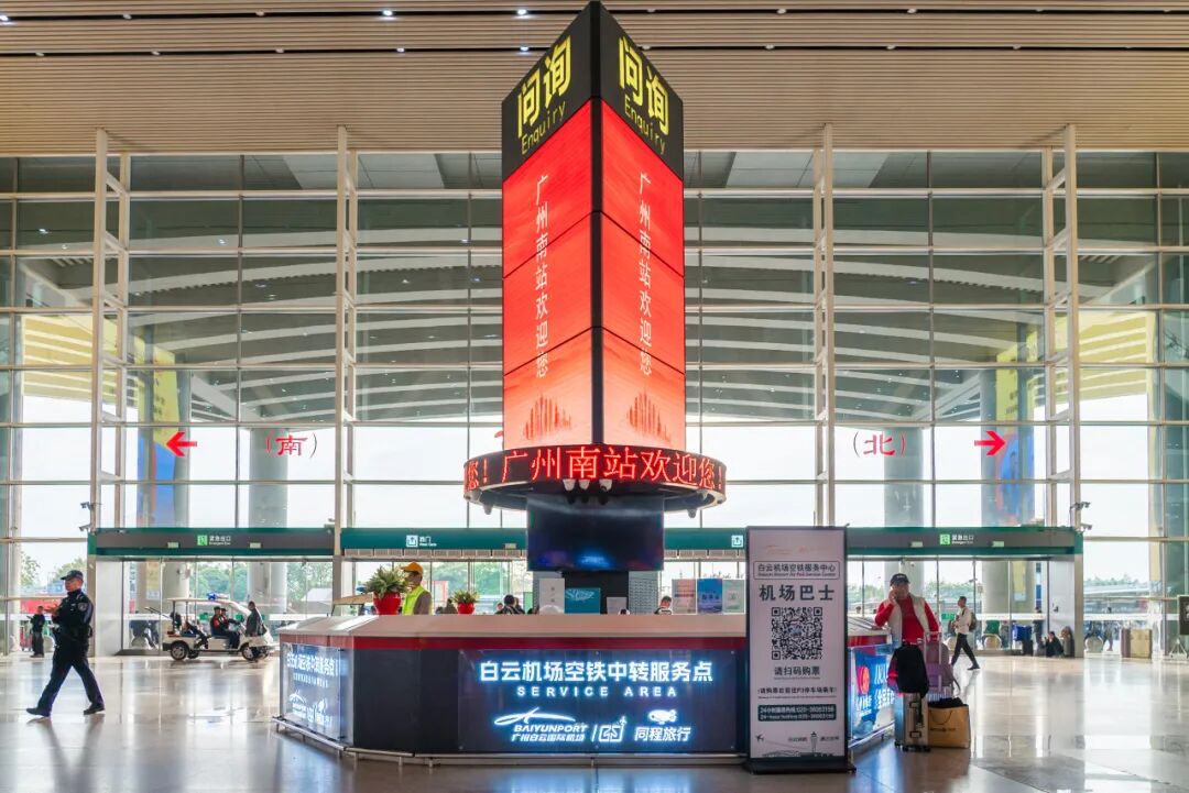 广州南站空铁联运乘车点位于车站P3停车场内,旅客可根据西门或P3停车场的指引路线,前往西南区综合商业中心,沿南站南路步行至“南10桥柱”处即可抵达。