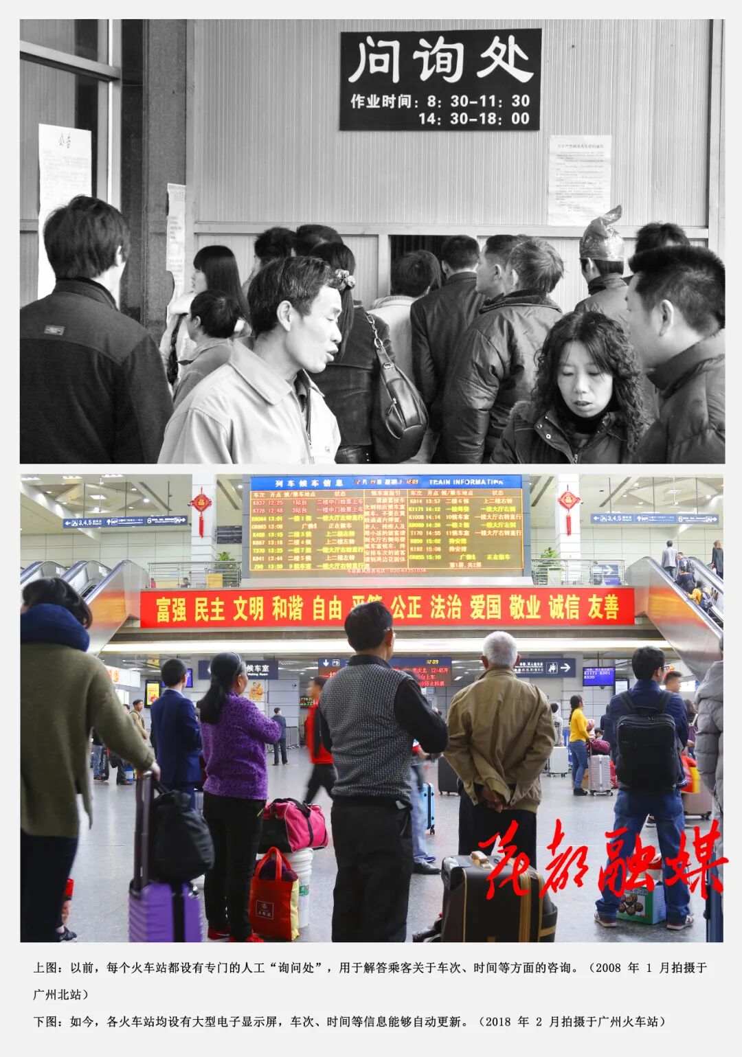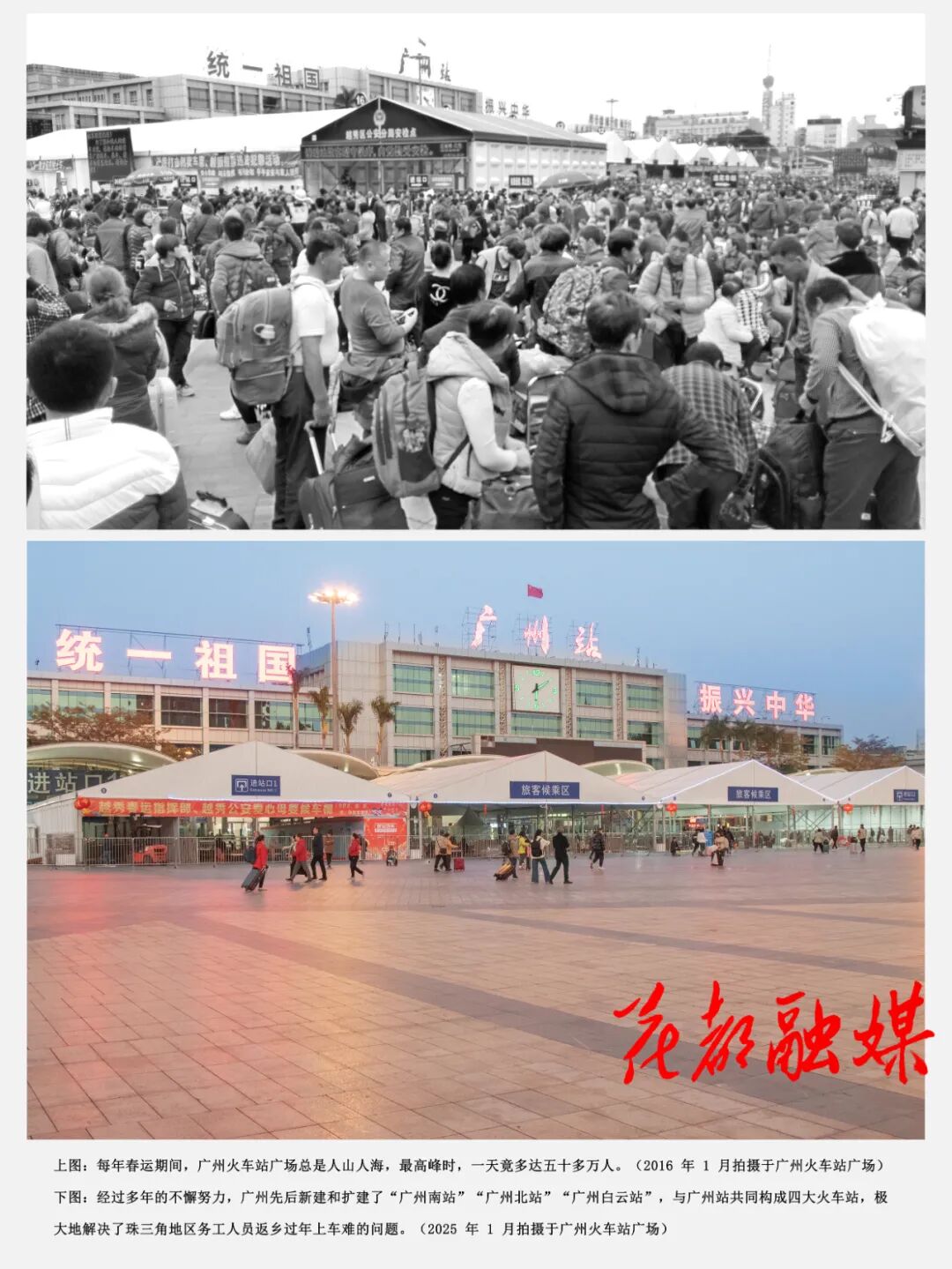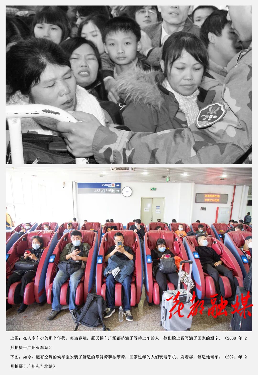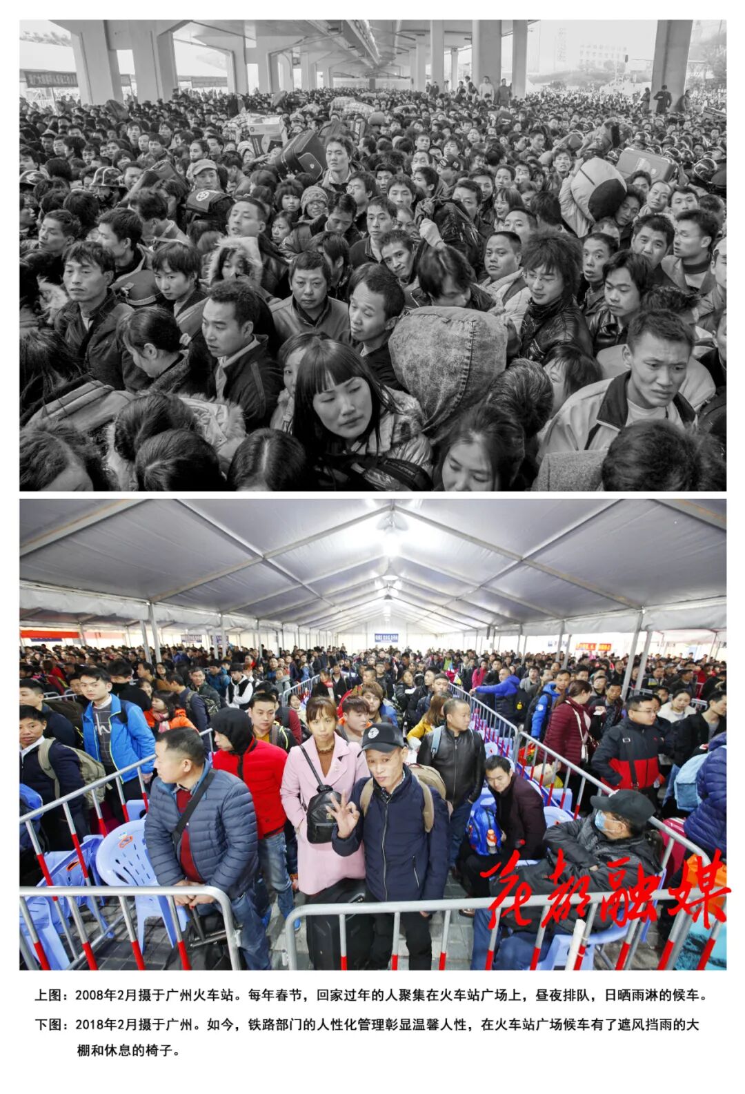 当年,在广州火车站露天广场上候车的返乡人员,遇上天气不好,在寒风冻雨中一等就是几个甚至十几个小时。