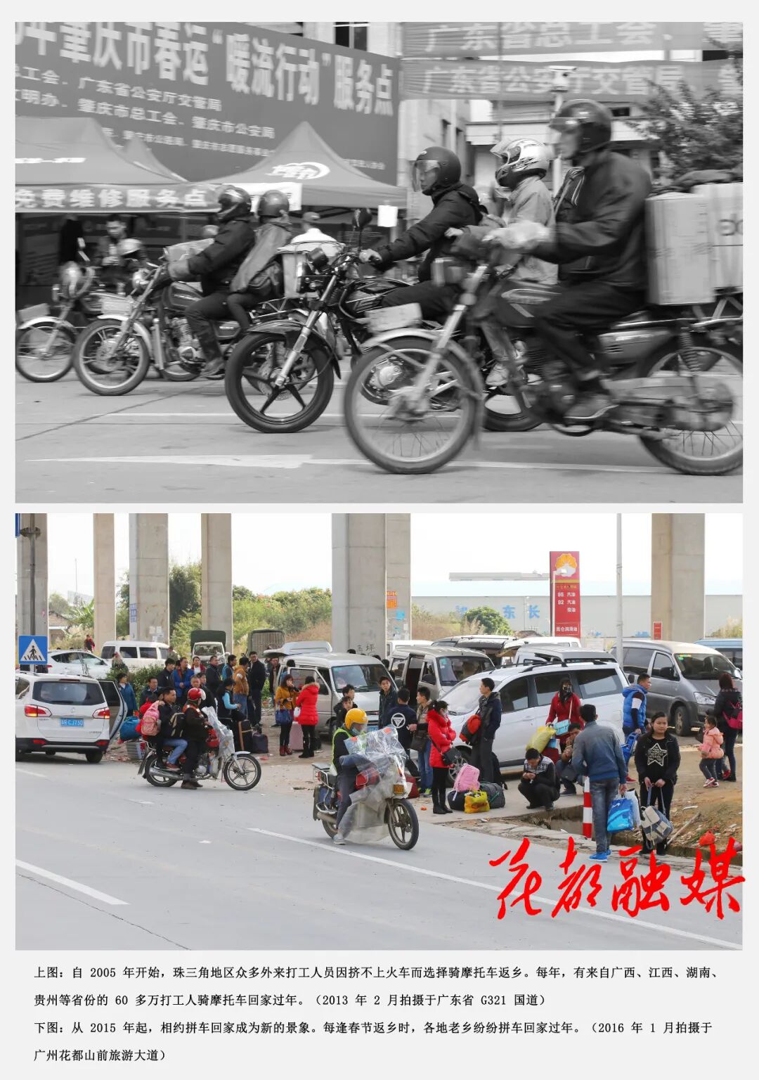 摩托大军高峰时,每天有上万部返乡摩托车前往广西、贵州、湖南等地,政府部门沿途设置暖行服务站,成了中国春运历史上一道靓丽的风景。