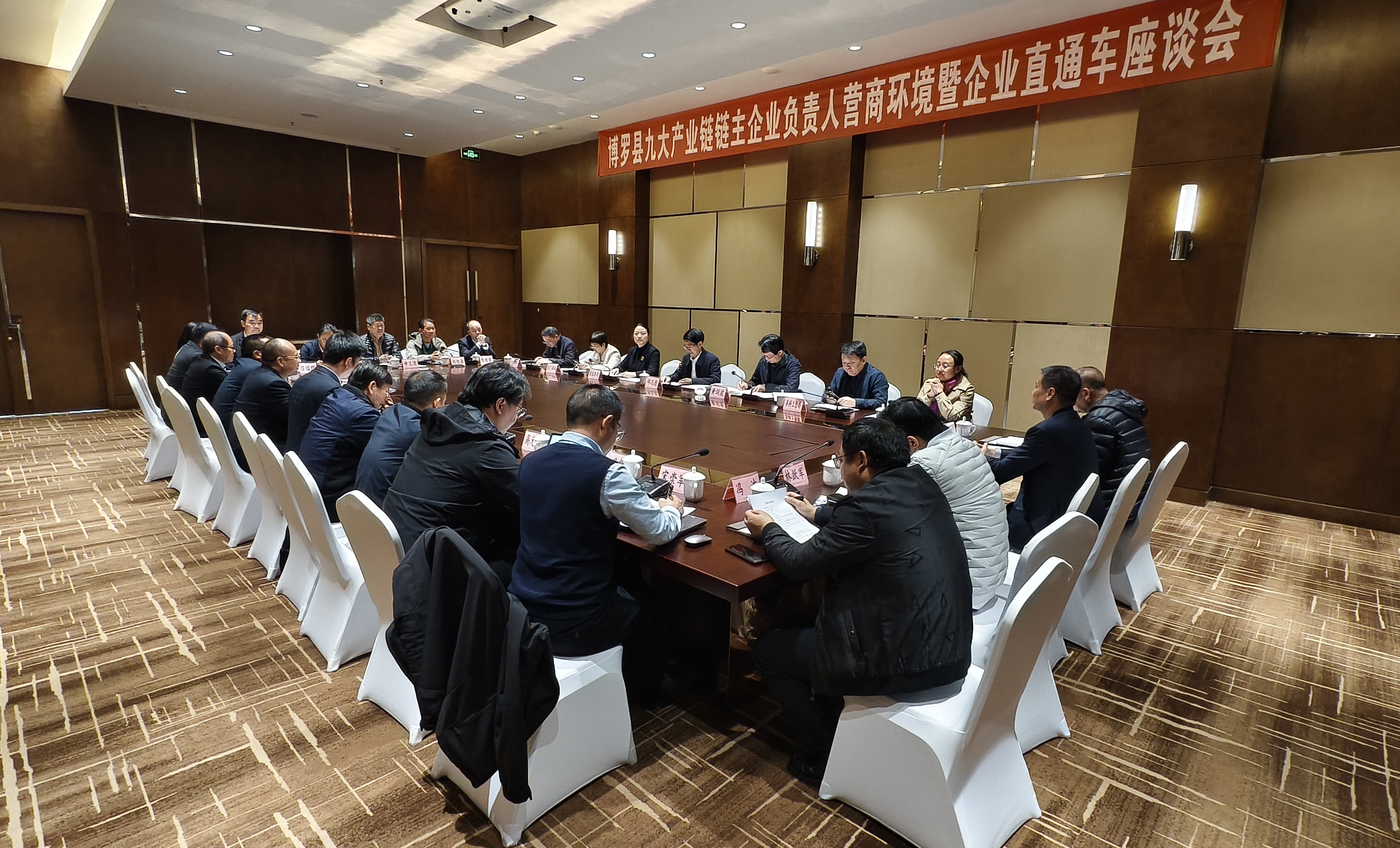 1月17日,博罗县召开九大产业链链主企业负责人营商环境暨企业直通车座谈会,邀请了22位链主企业负责人进行座谈交流,面对面倾听意见和建议,并现场协调解决制约企业发展的堵点难题。县委副书记、县长邱志彪,县委常委、副县长黄剑波及相关单位、企业负责人参加会议。