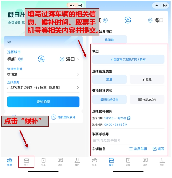 琼州海峡已全面实行预约购票,所有进岛的车辆及旅客一定要提前通过“徐闻港”“琼州海峡轮渡管家”“徐闻港购票平台”预约购票,合理安排行程,未预约不能进入港区。