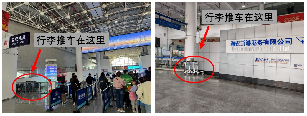 徐闻港、海安新港作业区目前暂无行李搬运服务,徐闻港可在综合交通枢纽二楼候船厅行李安检处,海安新港作业区在客运大厅行李安检处,无偿借用港口行李推车自行搬运。