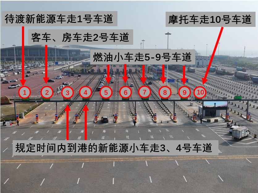 在非规定时间内到港(过早或过晚)的新能源车进港走1号车道,客车、房车进港走2号车道,在规定时间内到港的新能源小车进港走3号车道,燃油小车进港走5-9号车道,摩托车进港走10号车道。