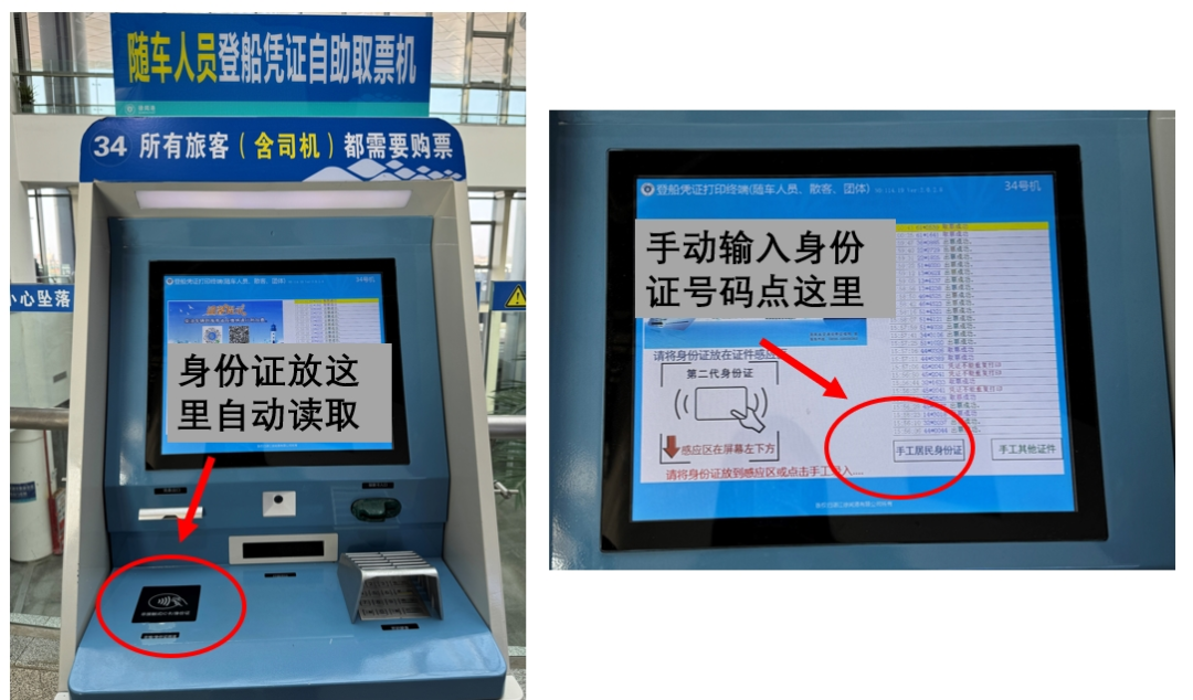 从徐闻港过海的小车随车客在小车安检处进行人车分离,需要携带身份证或户口簿等有效证件到综合交通枢纽二楼的自助取票机领取登船小票。无身份证的可输入身份证号码领取。