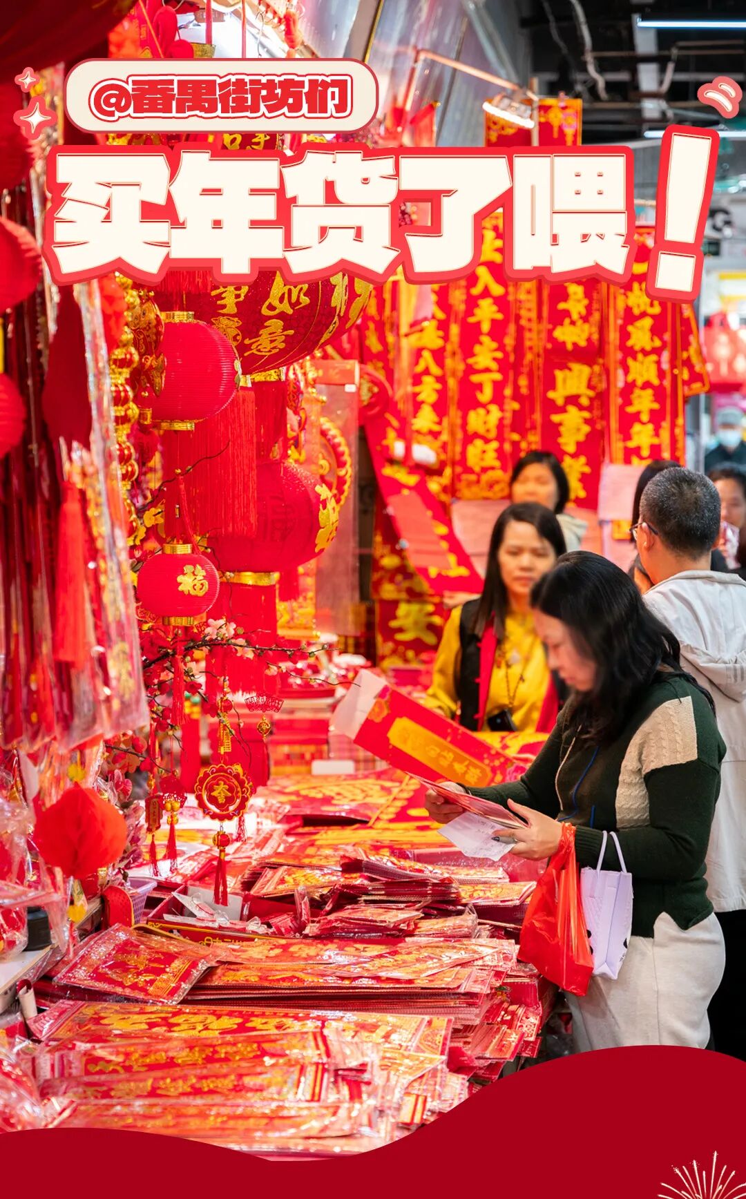 上街扫货,番禺的各大市场与花街无疑是街坊们的首选地之一,这里价格划算,性价比超高,各种新年装饰品、广府贺年美食、年花年桔应有尽有。