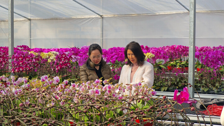 蝴蝶兰的娇艳绽放离不开精心培育。杨惠英说,为了让蝴蝶兰在春节前如期绽放,基地提前五个月就开始培育工作,随后将蝴蝶兰移入智能温室进行催花。为了给蝴蝶兰营造最适宜的生长环境,种植户们时刻紧盯温湿度变化。记者看到,当天的将温度精准控制在28℃,湿度维持在34%左右。“在种植蝴蝶兰这方面,我们的技术团队有着30多年的种植经验。”杨惠英说,他们会依据蝴蝶兰不同生长阶段,精确配比肥料浓度与浇水量,确保植株茁壮成长,并通过调控温度、光照时长等因素,让蝴蝶兰在预定时间娇艳绽放,为产业规模的扩大、产品品质的提升奠定了坚实基础。