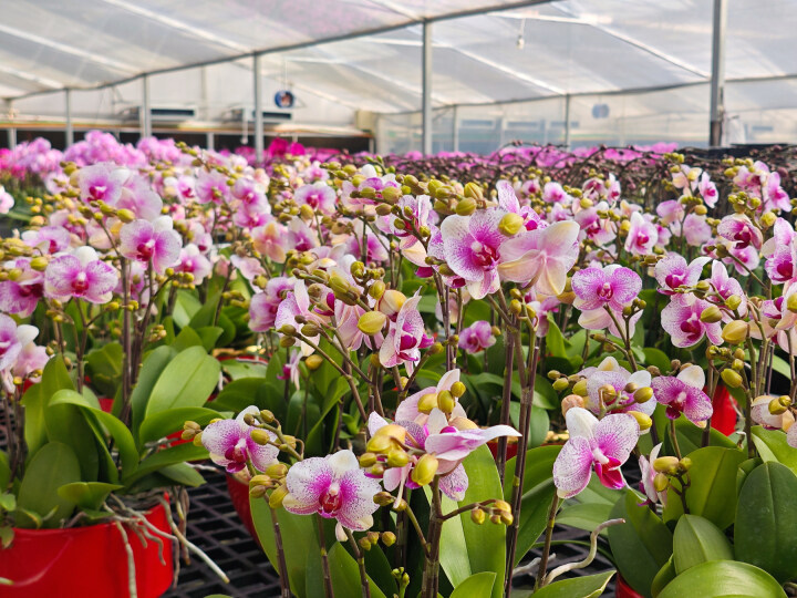 走进羊和村的蝴蝶兰现代化智能温室花卉大棚内,一股温暖而湿润的气息扑面而来,成千上万株蝴蝶兰争奇斗艳,蔚为壮观。其中的蝴蝶兰或已热烈绽放,或含苞待放,红的似火、粉的如霞,在翠绿叶片衬托下,洋溢着浓浓的节日气息。工人们正忙碌地装盆、打包,将一盆盆蝴蝶兰运往目的地。