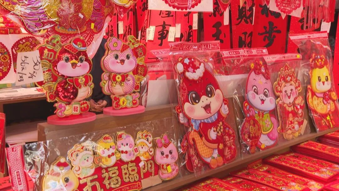 记者注意到,今年市场还推出了许多新颖装饰品,如蛇形生肖福贴、卡通摆设、立体春联等,深受年轻顾客喜爱。部分店铺还贴心地售卖除胶剂、浆糊等配套商品,方便市民购买后直接使用。