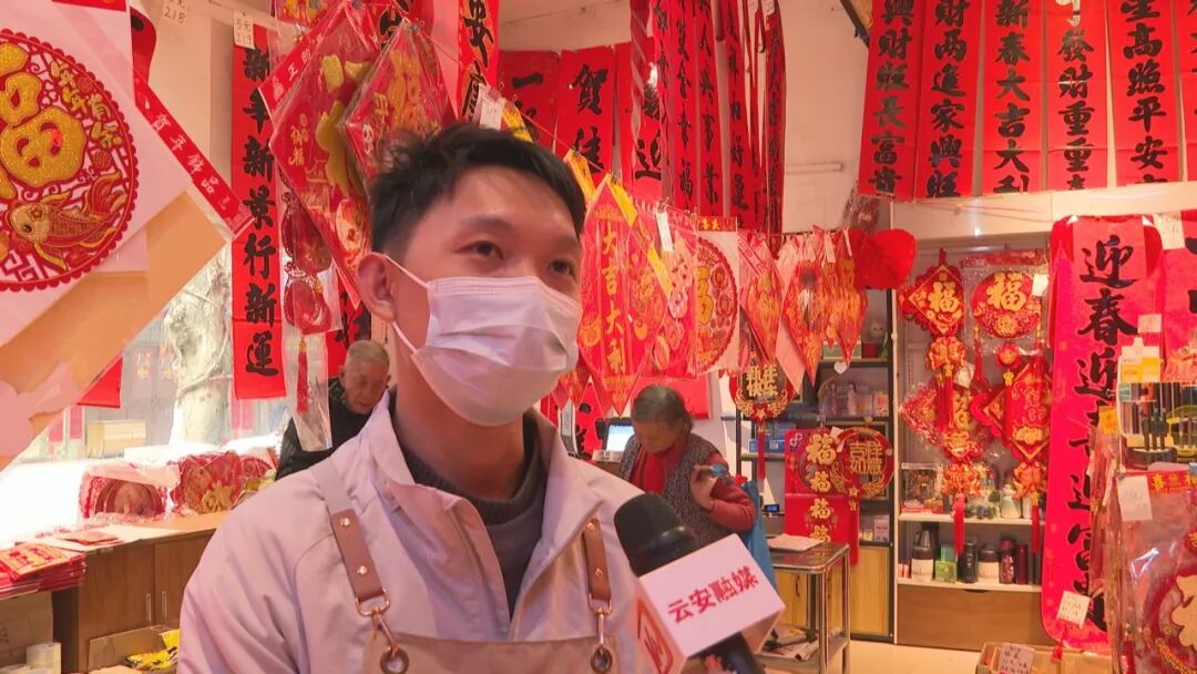 春联店铺店员 小罗:今年我们准备了很多传统对联,有精品对联、绒面的、包括精品挂饰等,各式各样都有。现在我们每位员工都加班加点,为顾客提供一对一的服务,帮助顾客选好一整套的春联和福贴带回家。