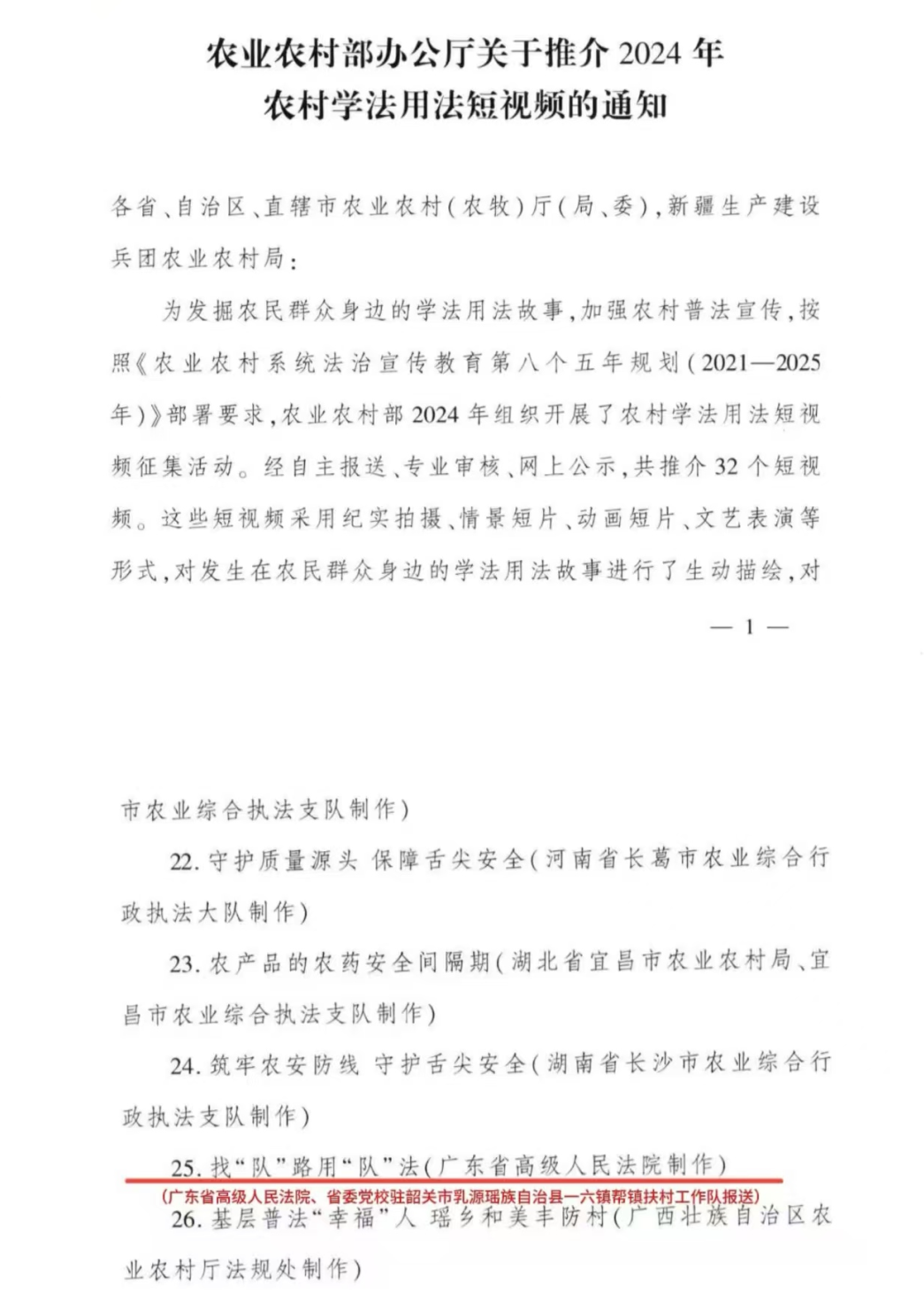 近日,农业农村部办公厅发布了2024年全国农村学法用法短视频推介名单,由广东省高级人民法院、广东省委党校组团派驻韶关市乳源瑶族自治县一六镇帮镇扶村工作队报送的短视频《找“队”路用“队”法》,成为全省唯一入选全国推介名单的优秀作品。