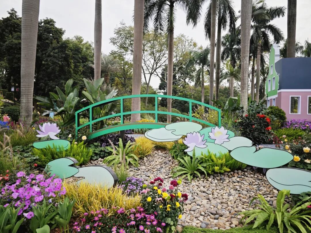 花卉整体布置以名画《郁金香田与莱金斯堡风车》为灵感,将多色郁金香组成的郁金香花田作为基底,同时融入莫奈故居元素,精心营造了多个打卡点。
