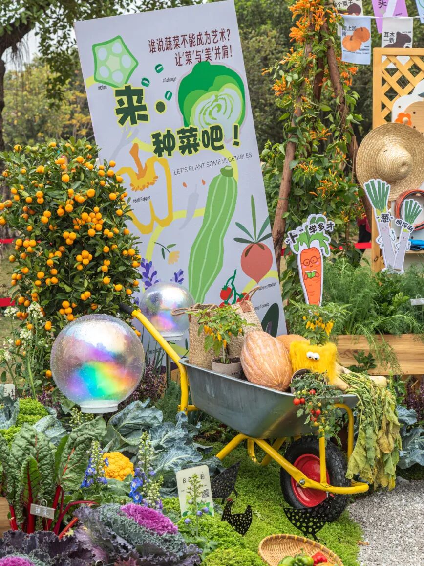 作品《和“畦”生菜》布置了葱、生菜等可以吃的植物,带着“柿柿如意”“和气生财”谐音梗祝福,让人看了心情立马变好。
