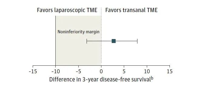 该研究成果于2024年被纳入美国结直肠外科医师协会(American Society of Colon and Rectal Surgeons (ASCRS))官方指南(Dis Colon Rectum. 2024;67(1):18-31)。3年无病生存率的分析显示,taTME组的3年DFS为82.1%(95% CI:78.4%至85.8%),对比传统经腹腹腔镜TME组的79.4%(95% CI:75.6%至83.4%),得出非劣效性结论。这一成果证实,taTME在3年DFS方面与传统经腹腹腔镜TME同样安全有效。