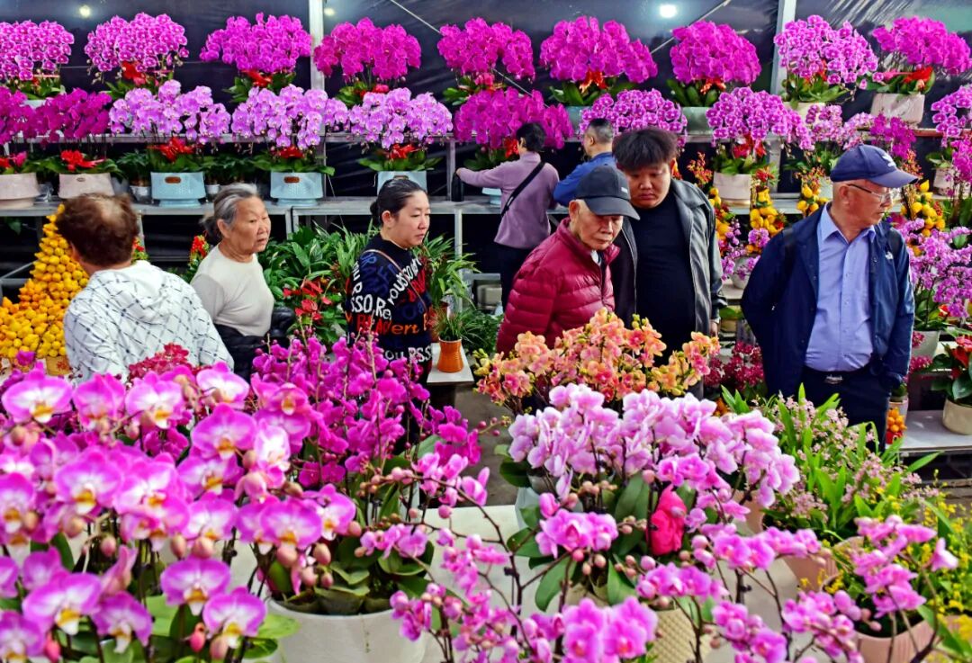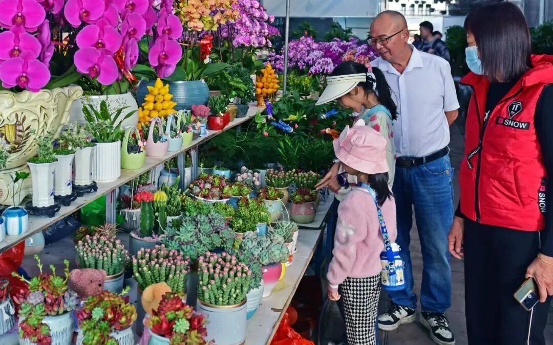 寓意吉祥发财的“年桔”、幸福美满“蝴蝶兰”、鸿运当头“红掌”……各种各样的迎春年花竞相绽放,现场人流如织、欢声笑语不断,不少市民携家带口逛花街,拍照打卡留念,定格“年味”美好瞬间。