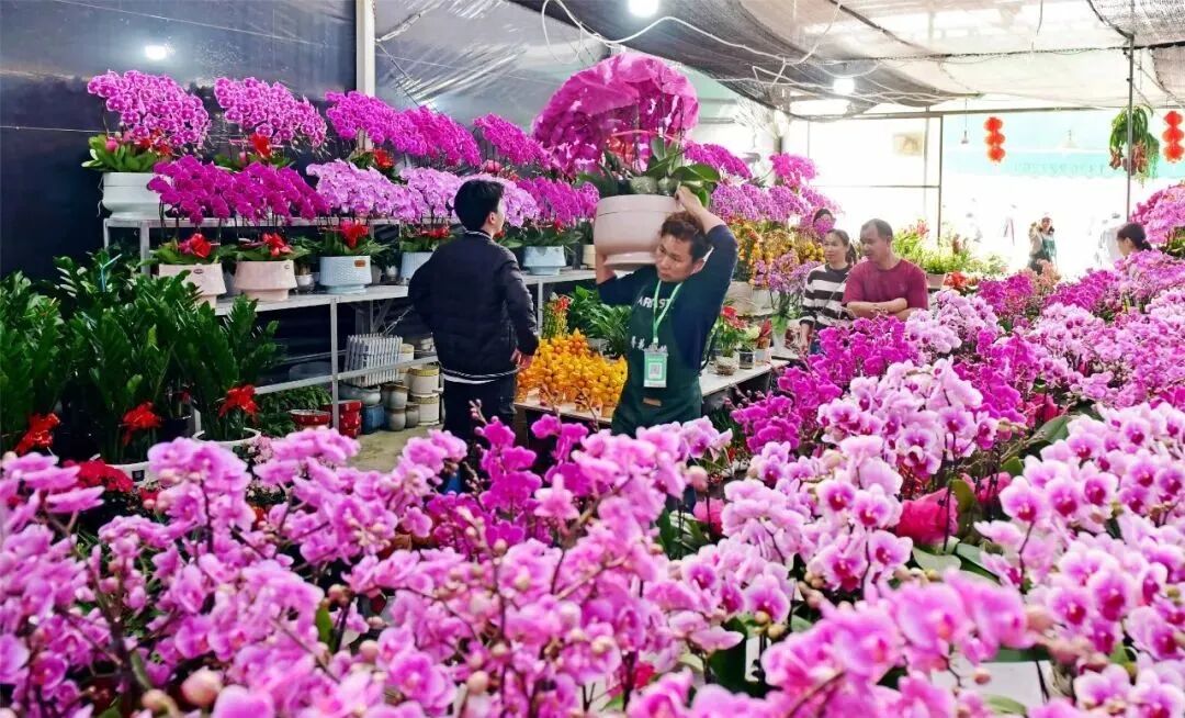 花都以“花”为名,花卉总产值是全区农业各板块的第一,现有花卉类农业龙头企业14家。全区花卉种植面积超过10万亩,主要产品为盆栽(盆景)、苗木和鲜切花三大类,2024年全区花卉总产值34.32亿元。今年迎春花市的年宵花种类众多,蝴蝶兰、大花蕙兰、红掌、杜鹃、桃花、百合、冬青、发财树、年桔等热门品种应有尽有,成为众多消费者目光的焦点。