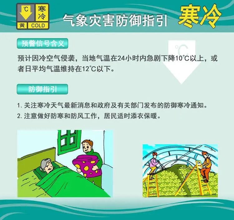 请注意防范冷空气带来的大风降温对农业、畜牧业及水产养殖业等的不利影响。