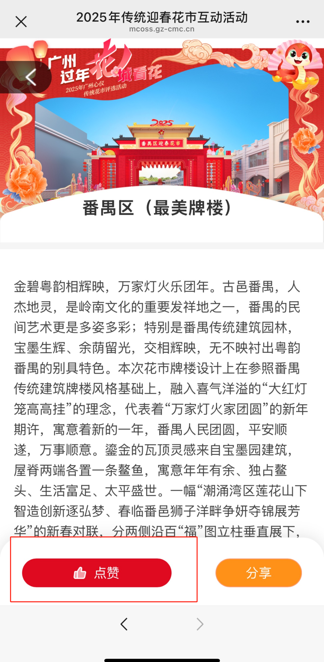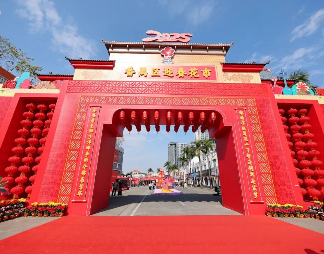 花市牌楼设计在参照番禺传统建筑牌楼风格基础上,融入喜气洋溢的“大红灯笼高高挂”的理念,代表着“万家灯火家团圆”的新年期许,寓意着新的一年,番禺人民团团圆圆,万事顺意。