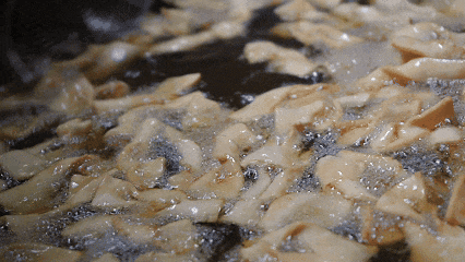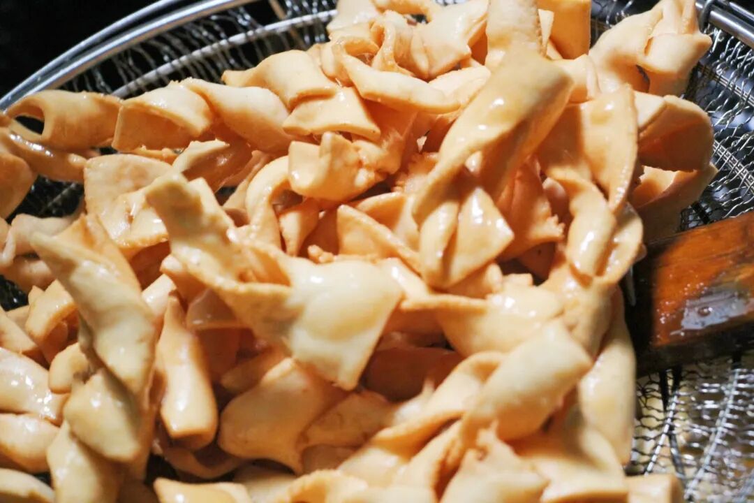 把面片放入锅中油炸至酥脆金黄色,即可捞起放置冷却,炸好的“鹅肠”金黄诱人卖相非常好看,酥脆可口香味在入口咀嚼的那一刻飘散开来。